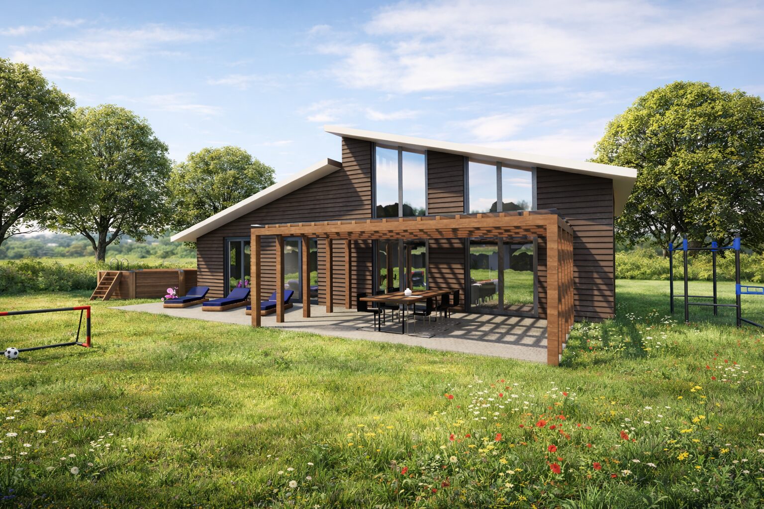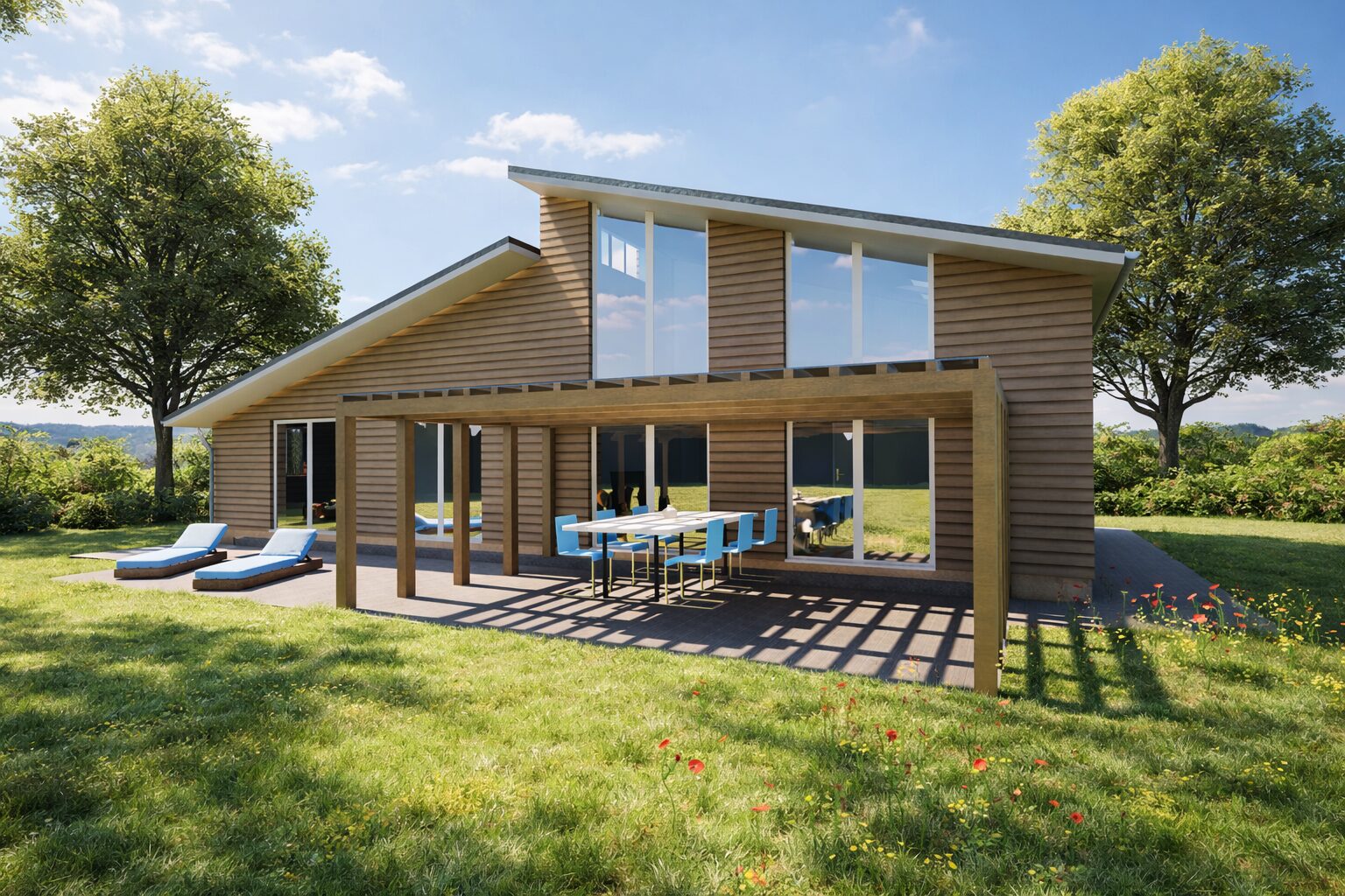 Große Fensterflächen und durchdachte Sichtachsen schaffen ein einzigartiges Wohngefühl mit viel Tageslicht. Gleichzeitig ermöglichen sie einen direkten Blick in den Garten und verbinden Innen- und Außenraum auf harmonische Weise. Die Terrasse wird dabei zum erweiterten Wohnzimmer – ideal für entspannte Stunden im Freien oder gesellige Abende mit Familie und Freunden.